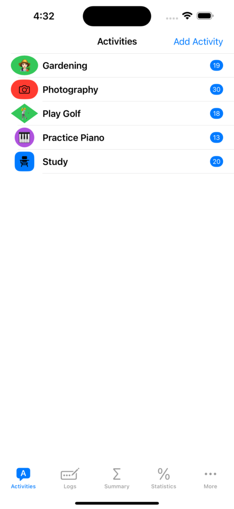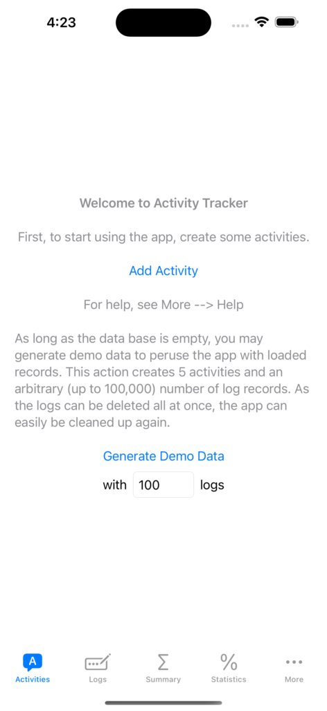 Here, you are also given the chance to create some demo data with which to play around. This creates 5 activities (Gardening, Photography, Play Golf, Practice Piano, and Study) and up to 100,000 randomly generated logs assigned to them at random. With one bulk delete of the logs and five swipes to the left to delete the activities, the app is easily cleaned up again.