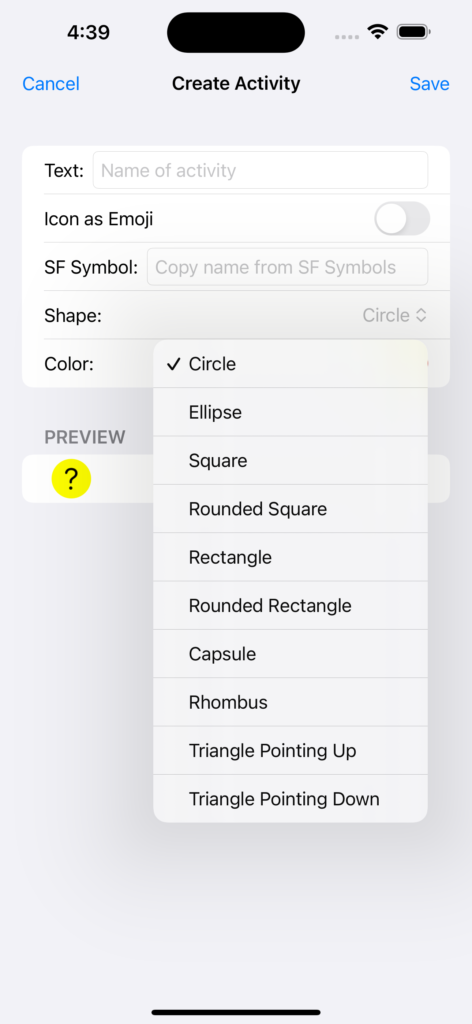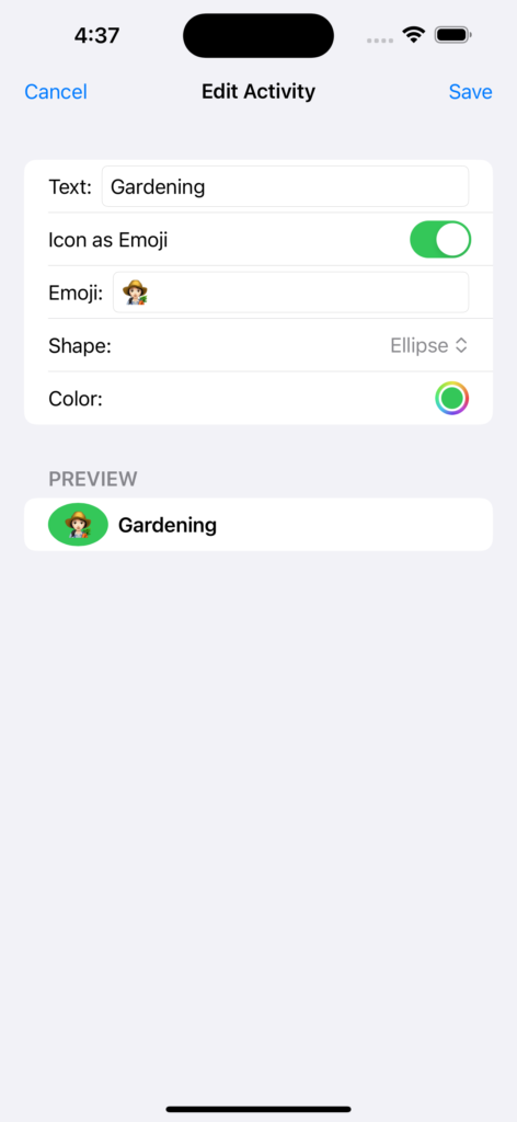 The symbol may be defined by an emoji character or the name of a SF symbol as provided by Apple (download the application to your mac from https://developer.apple.com/sf-symbols/ or use a third party app from the App Store). In the demo data the two activities Photography and Study use the two SF symbols ‘camera’ and ‘studentdesk’ respectively.