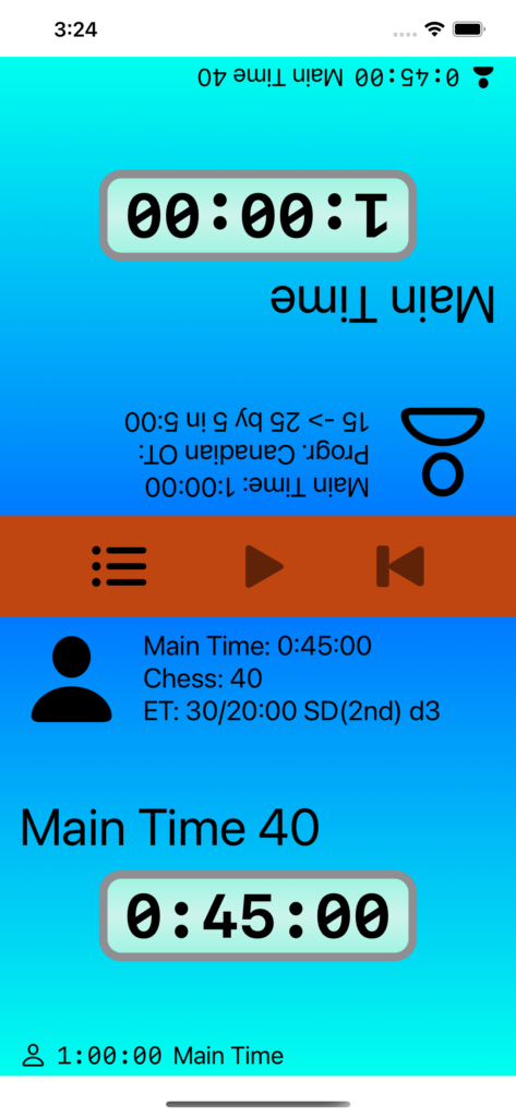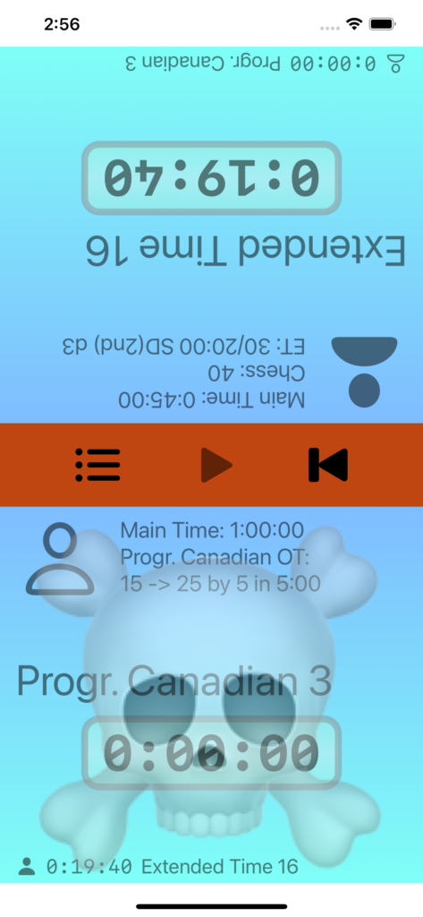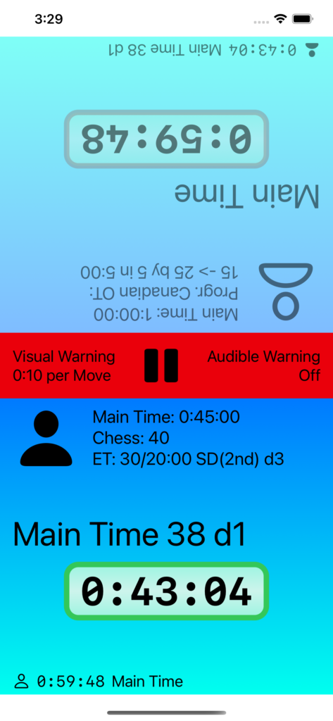 While playing one clock is running its time down whereas the other is stopped and its panel dimmed and inactive. The border around the running clock is changed from grey to green. When running out of time and visual warnings are set, the border color changes to red. In the screenshot to the left it is Black’s turn. He has 38 moves to go during the main time and is down to the last second of the delay of 3 seconds. I.e. his clock is not running yet.